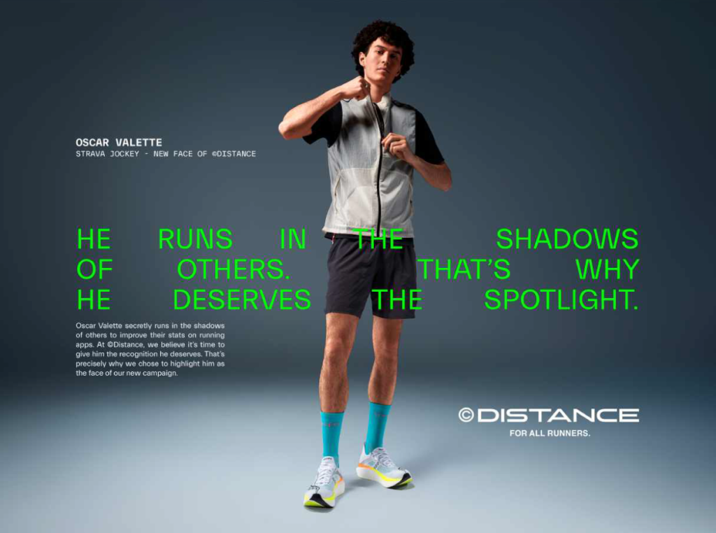 Face à cette réalité, la marque Distance prend position et agit en mettant en lumière celles et ceux qui courent dans l’ombre, afin de leur offrir reconnaissance et véritable statut. Avec une campagne publicitaire ambitieuse intitulée “Shadow Runners”, Distance fait ainsi de cinq Strava Jockeys – Oscar, Clara, Ousmane, Howard et Eva – les nouveaux visages de sa marque. Un vrai contrat, un vrai shooting photo et vidéo, au niveau des standards des plus grandes marques de sport. L’objectif est clair : mettre en lumière ces sportifs de l’ombre, souvent exploités.
