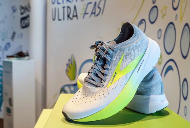 L’Hyperion Elite est un modèle à part chez Brooks. Ses ingénieurs y ont intégré une plaque de carbone et ont délesté un maximum le modèle afin de proposer ici une paire de chaussure ultra légère et hyper dynamique, « la plus rapide jamais conçue » par la marque. De quoi affoler les chronos ? Brooks était jusqu’alors plutôt réputé pour offrir à ses clients des modèles très confortables et sécurisants, pas forcément destinés à aller décrocher les plus beaux chronos. En 2020, après une année 2019 chamboulée par Nike et ses Vaporfly, Brooks a décidé de changer d’orientation en proposant pour la première fois un modèle avec plaque de carbone. L’intérêt de cet apport est désormais bien connu : il est censé créer une sorte de rebond supplémentaire à chaque foulée, comme un effet ressort. L’objectif ultime étant de gagner des secondes précieuses à chaque kilomètre avalé. Impossible clairement pour les coureurs à pied au niveau modeste d’y voir un véritable moyen d’approcher les chronos…