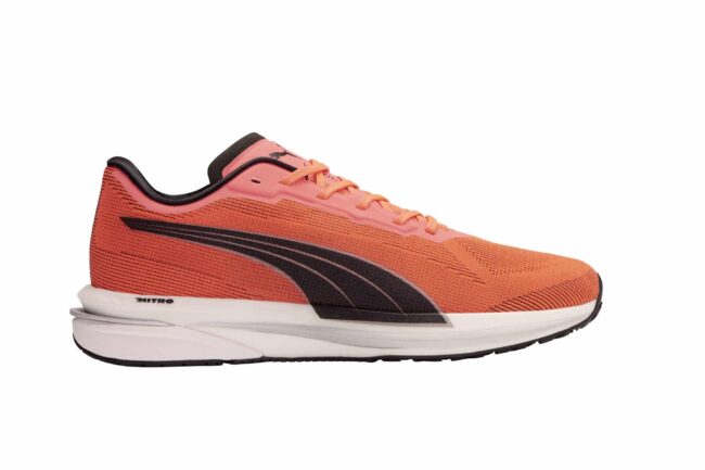 En début d’année, Puma a fait son grand retour dans le monde de la compétition en course à pied avec sa gamme Nitro. Au total, quatre modèles ont été créés, dont la Velocity Nitro, laquelle propose du confort mais aussi de la vitesse ! Puma veut s’affirmer sur le segment « performance » du marché de la chaussure de running et a présenté au printemps une gamme composée de quatre modèles : la Velocity Nitro s’incruste comme le modèle sans doute le plus polyvalent. Au visu, le design est déjà réussi avec un beau rouge flashy, qui donne, d’entrée, l’envie d’y plonger ses pieds. Une fois ceux-ci insérés, le ressenti est parfait. On se sent directement enveloppé avec un ajustement idéal, même si, une fois la chaussure lacée, on ressent une légère pression sur le coup de pied. Mais en course, cette pression se relâche naturellement, on vous rassure. L’empeigne est simple, composée d’un mesh technique relativement souple et plutôt léger. Les renforts sont présents avec discrétion à l’arrière…